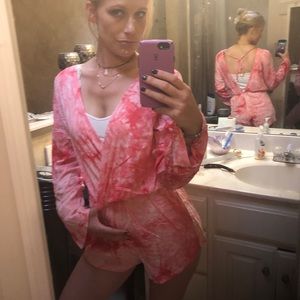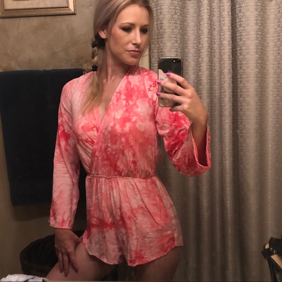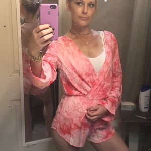 Super cute tie dyed romper by Honey Punch. Adjustable tie in the back for different looks. Can be worn by itself or used as swimsuit cover or even as shirt with a skirt or shorts over the bottom part. Beautiful material and quality.
