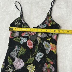 Honey Punch sheer floral embroidered bodysuit — Size S. Stunning multicolor floral embroidery on a black sheer mesh body with adjustable straps and working snap closure. Lightweight, delicate, and perfect layered under a blazer, slip dress, or worn with high-waist denim for a night out. Excellent pre-owned condition — no pulls or stains. From a smoke-free, pet-free home. Ships 1–2 business days. Offers & bundles welcome!