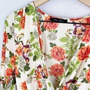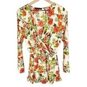 Honey Punch Surplice Wrap Long Sleeve Floral Romper Cream Orange Green Small