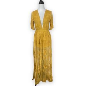 Honey Punch Mustard Yellow Lace Crochet Maxi Overlay Romantic Boho Maxi Dress