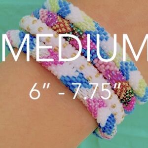Honey Rose Sashka Bracelets are made with the worlds finest glass and sterling silver beads . They are handmade by skilled Artisan in Kathmandu Napel . Bead by bead they are crocheted. They roll over your hand and retract to your wrist.