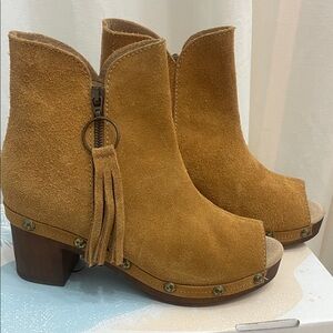 Elevate your style with these chic suede peep-toe ankle boots. features stud detailing and decorative fringe tassel on side zip closure Crafted for comfort and elegance, these ankle boots are perfect for any occasion. Runs true to size if you wear a half size I recommend sizing up. If you normally wear a 7 1/2 purchase a size 8. New with box