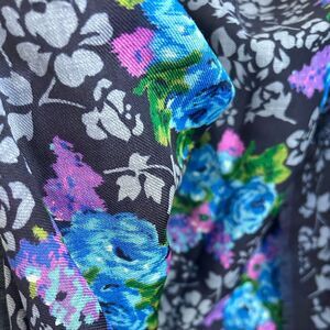 Vintage Honey 100% wool scarf. Has dark and pale blues with florals and greenery print. Has a delicate frayed edge. Logo printed in corner. Some threads coming out from age.