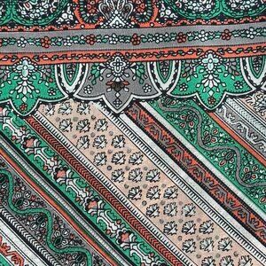 This vintage Honey silk scarf features a long, rectangular design with a peach background accented by paisley and stripe motifs in shades of brown, gray, and cream. Made in Japan, this piece is finely crafted with a hand-rolled hem and a lightweight drape. Measuring 10 x 50, this versatile scarf can be styled as a neck scarf, head wrap, or tied to a handbag for a boho-chic accent.