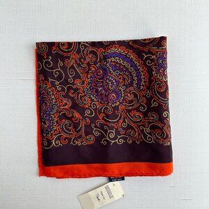 This vintage Honey silk scarf features a striking paisley and scroll design in rich tones of brown, orange, gold, and purple. Made in Japan with a hand-rolled hem, this square silk scarf is finely crafted and versatile for everyday wear or as a collectible designer accessory. Its 30" square size makes it perfect as a headscarf, neck scarf, or tied to a purse for a pop of color.