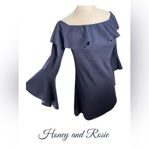 • The dress features an off-the-shoulder neckline, a ruffled bodice, and bell sleeves.