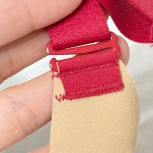 The red color is best seen in the first picture. The straps can be unhooked in the back and worn criss cross if desired.