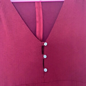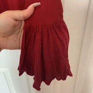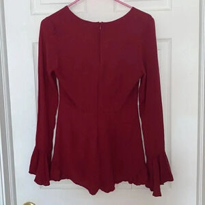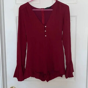 Like new. Maroon bell sleeved romper. Buttons up the front and has a zip back. No size tag but I would say fits small-medium. Waist measurement is 27 inches.