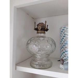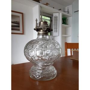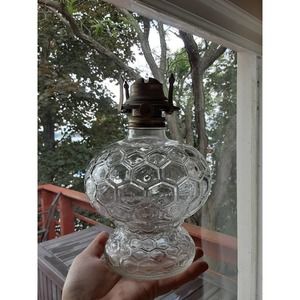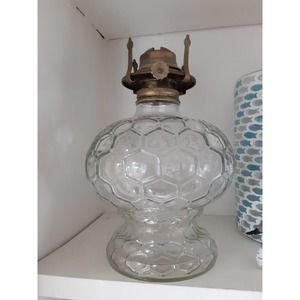 This is a gorgeous oil lamp base in a honeycomb pattern! The top screws on securely to add oil.The Knob reads Paris lamplight, which I believe is Lamplight farms that began in the mid 60's and faded out mid 80's. This is in excellent condition and sits sturdy. This does not come with a wick or the glass top.