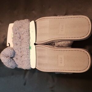 Faux fur trim on slippers, indoor/outdoor sole, cushioned foam footbed