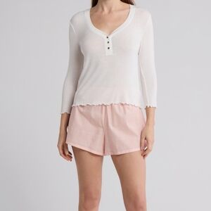Cozy long-sleeve top with button detail. Soft pink shorts with a relaxed fit.
