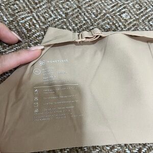 The Honeylove Crossover Wireless Bra in size XL is a comfortable and lightweight option for women looking for minimal support. Made from a nylon blend with added spandex, this bra features a solid beige color and a classic crossover style. It comes with removable pads and a hook-and-eye closure for easy wear. Designed for hand wash only, this bra is a stylish and practical choice for everyday wear.