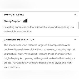 This shapewear short features targeted X compression with doubleknit panels to sculpt without squeezing, stopping right at your natural waist. With a 8 1/8" inseam, these shorts offer full thigh shaping. An opening in the gusset makes bathroom trips a breeze. Pairs perfectly with low-back clothing styles and high-waist bottoms.