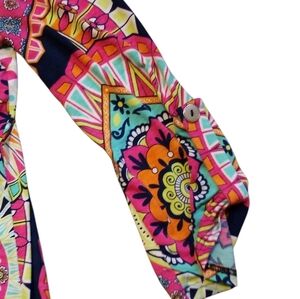 6Honeyme offers a versatile and stylish multi-colored tunic with a flattering V-neck and button accents. The 3/4 sleeves and pullover closure make it easy to wear for various occasions, from casual to business. Made in the USA, this lightweight and breathable knit top features a paisley pattern and raglan sleeves for a relaxed fit. Perfect for all seasons, this tunic combines style with comfort for a fashionable look. Vibrant geometric patterns. Long sleeves. Perfect for casual outings.