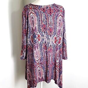 Honeyme Red, White & Blue Paisley Design Tunic, Longer on the Sides, Size 1X