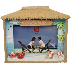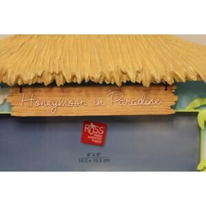 The "Honeymoon In Paradise Hut" 3D Photo Picture Frame by Russ is a rectangle-shaped frame made of resin, designed to hold a 4 x 6" photo. With a multicolor theme, the frame features a tropical honeymoon hut design. It has dimensions of 7" in height, 8" in length, and 1.5" in width, making it a charming addition to home décor.
