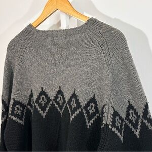 Very soft and smooth Eddie Bauer lambswool sweater featuring a gray-to-black Fair Isle geometric yoke with raglan sleeves. Soft, mid-weight knit with a classic heritage outdoor look. Made in Hong Kong, earlier Eddie Bauer production. Clean overall with no major flaws noted.