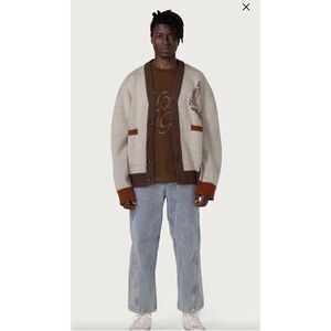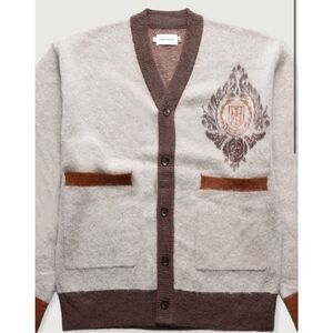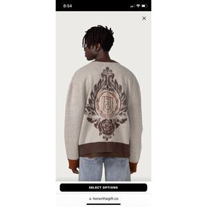 Keywords: Honor The Gift, Cardigan, Sweater, Knit, Crest Logo, Brown Trim, Beige, Oversized, Menswear, Contemporary Fashion, Streetwear, Casual, Button Front