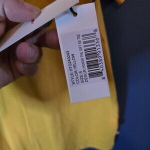 The product is a small, regular fit t-shirt by the brand Honor the Gift. It features an embroidered design on the front, making it a unique and stylish option for unisex adults. The t-shirt comes in a vibrant yellow color with a crew neckline, perfect for casual wear.