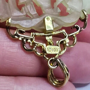 This exquisite vintage pendant features an intricately carved jade design, symbolizing elegance and cultural heritage. The 18K gold setting adds a touch of luxury, highlighting the craftsmanship of a bygone era. An elegant piece for collectors of vintage jewelry, it seamlessly blends artistry with timeless style.