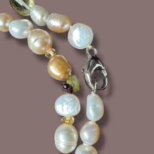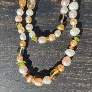 Vintage freshwater pearl and gemstone necklace by Honora. Features iridescent ivory, blush and champagne pearls, with Citrine, Smoky Quartz, Peridot and Garnet crystal beads. 40 long for layering. Sterling Silver clasps. There is a matching pair of blush drop pearl earrings with 925 sterling hooks. Perfect for any occasion. Comes with a Honora pouch.