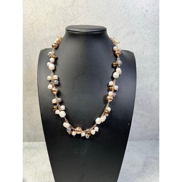 Elegant Honora gold tone chain necklace with pearl and various size gold tone and grey bobbles. A perfect versatile wardrobe staple for many occasions.