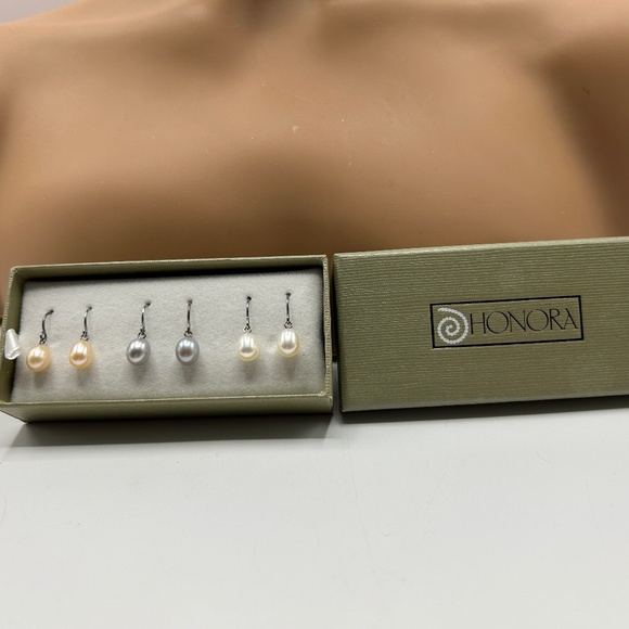 Beautiful Honora Cultured Pearl Earring Set featuring three pairs of classic pearl drops in soft neutral tones — peach, silver-gray, and creamy white. Each pair is crafted with genuine cultured pearls on sterling-style hooks, giving them a timeless, elegant look suitable for everyday wear or special occasions.