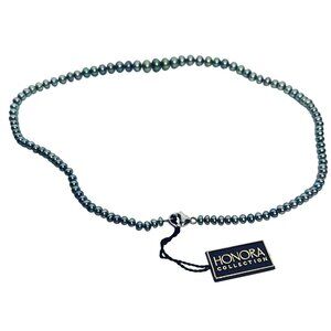 This charming Honora choker necklace, adorned with lustrous green freshwater pearls, exudes an air of vintage elegance. The necklace, accompanied by a delicately embroidered floral silk bag, is a sophisticated accent for those who appreciate timeless beauty. Its graduated pearl design captures light beautifully, ensuring a touch of classic glamour.