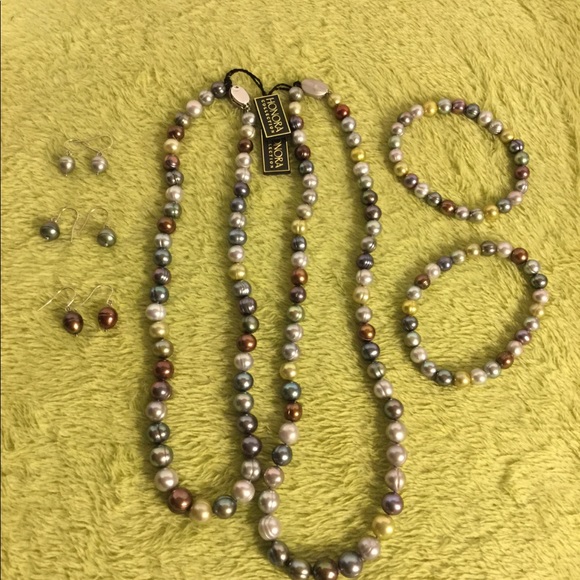 These are gorgeous, brand new, never worn, Honora sterling silver multi colored, hand knotted ringed pearls. The bracelets are beaded on a stretch band. The set includes: