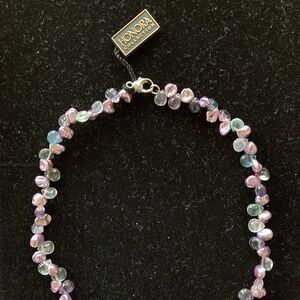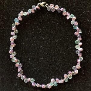 Blooming with color, keshi-shaped violet cultured freshwater pearls alternate with teardrop-shaped green, blue and purple fluorite beads to create this stunning necklace
