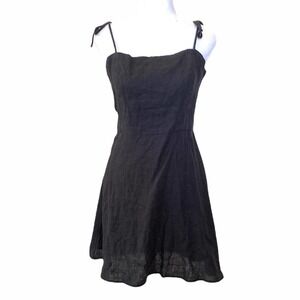 Honorine Poppy Linen Mini Dress in black ft. adjustable tie string straps, invisible back zipper, square neckline, fit and flare shape, lightweight breezy linen fabric, unlined