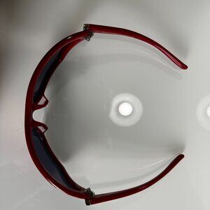 A bold goggle style red acetate frame designed with a flat front top. The metallic collaboration logo at the temple edges accentuates the identity of both brands. Fitted with 99.9% UV protecting red mirrored lenses.