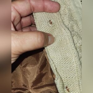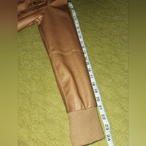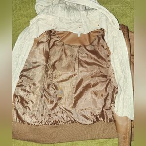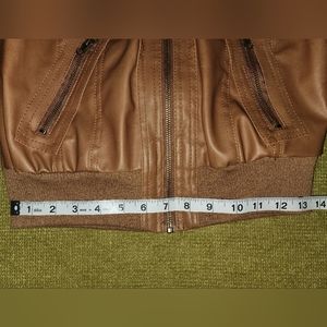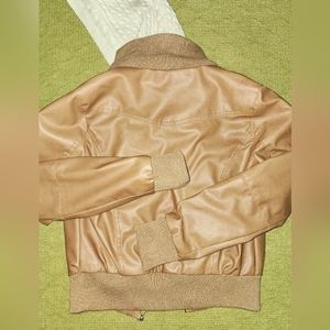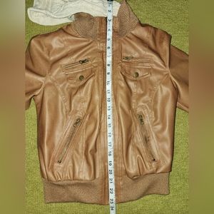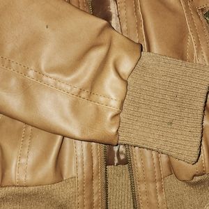 Super cute (fake) leather jacket. Beautiful camel brown color. The hood is easily detachable! The jacket has a few minor marks as seen in the photos, but they really are quite insignificant for the overall quality.