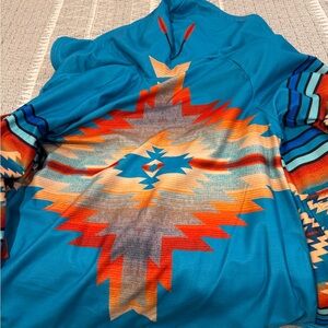 Vibrant hooded poncho featuring a tribal pattern. Includes shades of blue, orange, and red. Perfect for adding a pop of color to your outfit. Replica Beth Dutton Yellowstone Jacket as worn in series. Very warm and soft with toggle closure. Inside small pocket for phone or other items. Used only a few times. Like New!