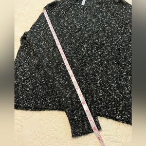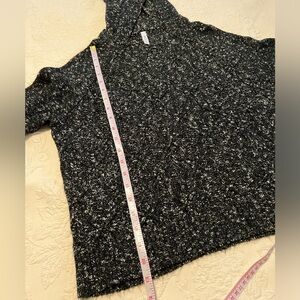 Black and white hooded long crop sweater with knit pattern.