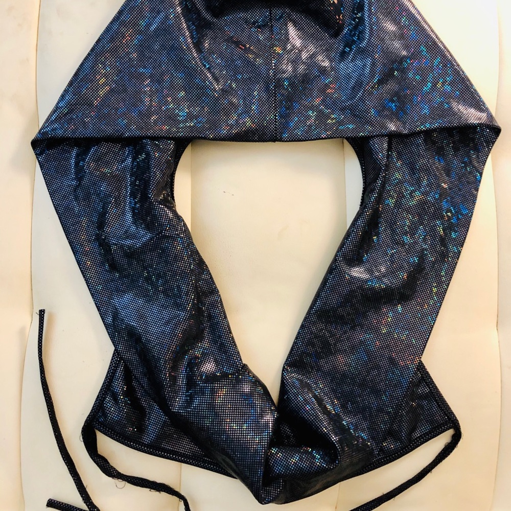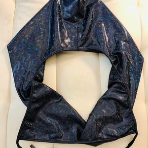 Hooded halter race top made from spandex material. Holographic. Stretchy. Ties in back. Worn once. In perfect condition.