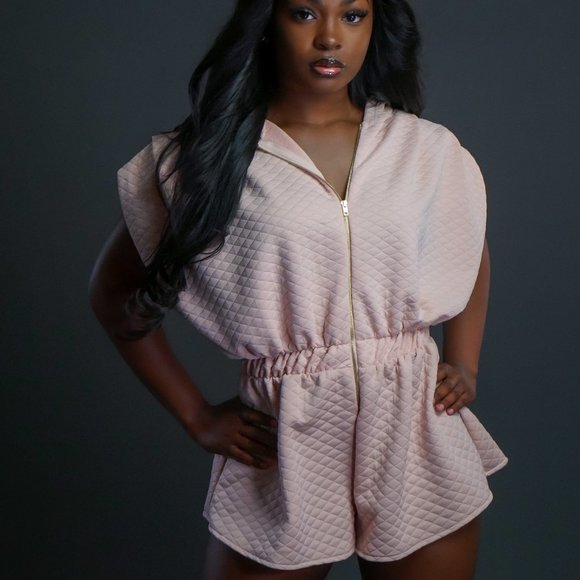 Pastel Pink Romper. Model is wearing a size Large. Note that this romper runs small. Please message for additional details.