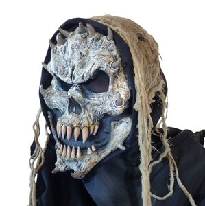 Terrifying skull mask with a black hood. Perfect for Halloween or costume parties.