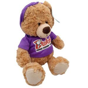 • Teddy bear is wearing a purple hooded shirt with "Duke's Mount Vernon Texas" on the front.