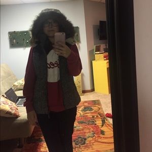 Grey and cream and black vest with fur hood.