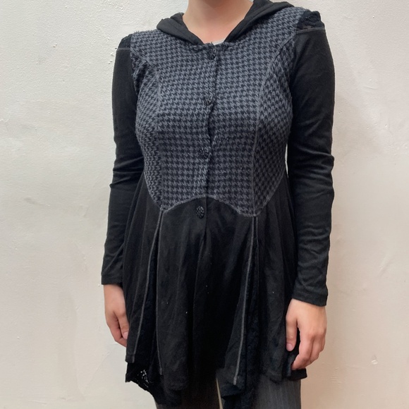 hooded button down tunic with really interesting lace and seam details. button down front can be worn open or closed. handkerchief hem. very steampunk esque with black and grey houndstooth. pit to pit '17 in