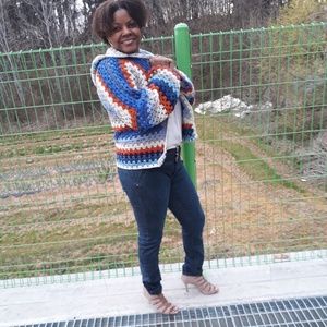 Gorgeous cardigan with hood. Handmade crochet with a range of blues creams and orange. It's long sleeves and waste length. Fits size medium and large. All my crochet pieces have set prices and made with quality yarn and special care. Please no low balling.