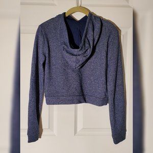 Cropped pullover sweater with long sleeves, drawstring hood, and front pocket. Dark blue heathered material.