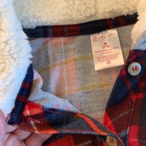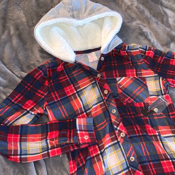 Red Flannel with hood. Nice thin material!! Never worn. Could fit a size small bigger/comfy but also fits size medium!!