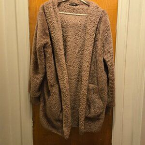 Hooded fuzzy cardigan (open front) - Unique Color: Purplish Brown