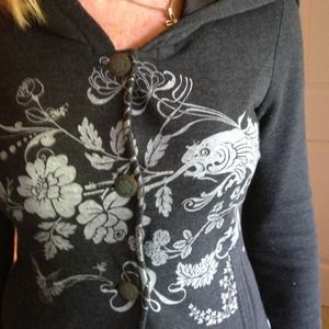 Gray hooded jacket with flowers and koi designs on front. Medium weight cotton with lining. Made by Gentle Fawn.