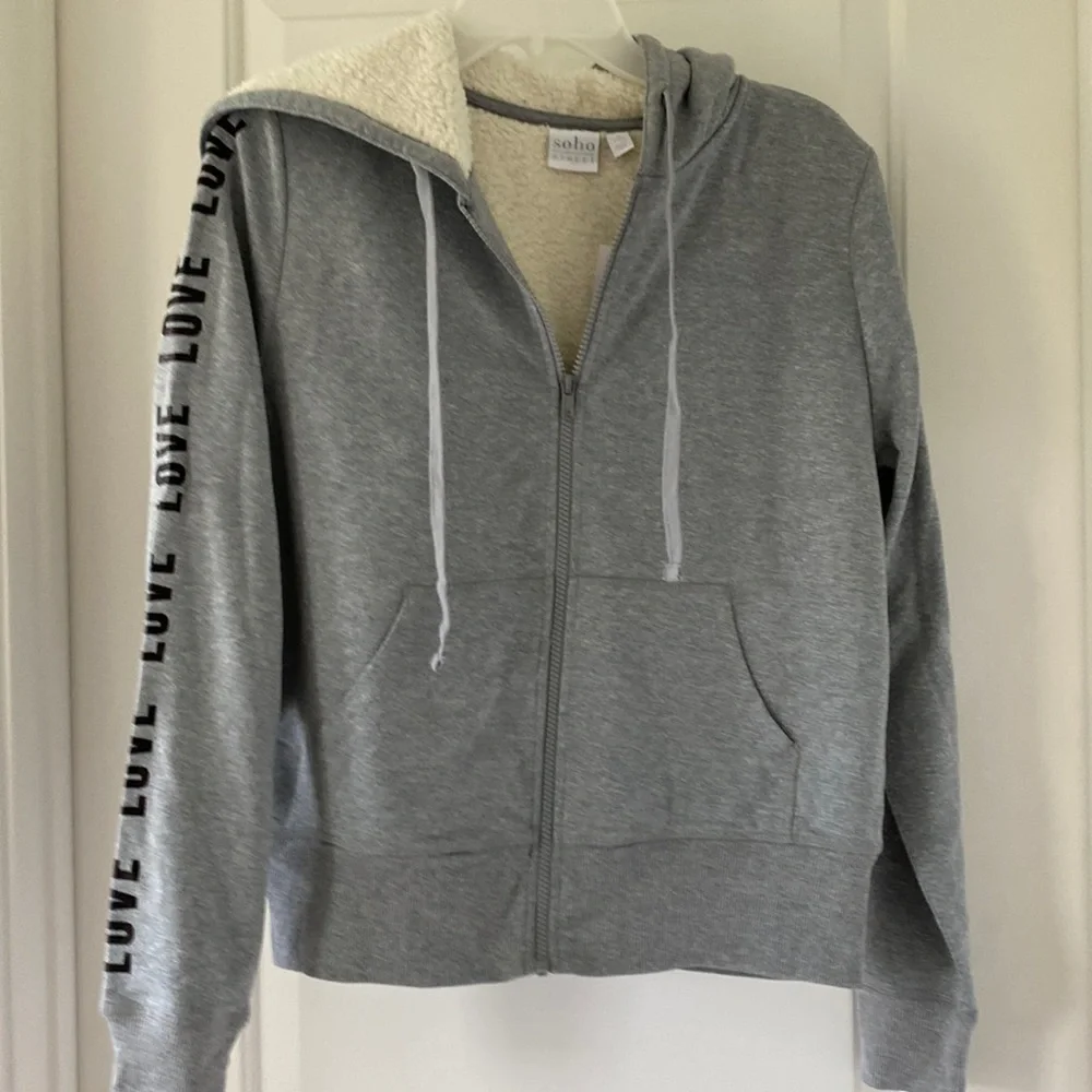 Long sleeve hooded Sherpa lined jacket with front pockets.