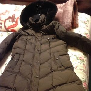 Women's long puffer coat with hood. Very warm. Perfect for winter. Below knee length.
