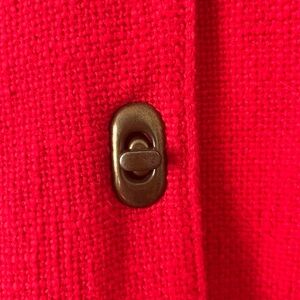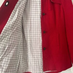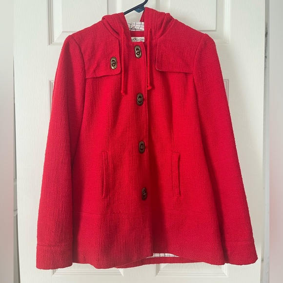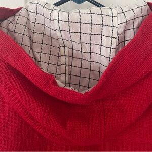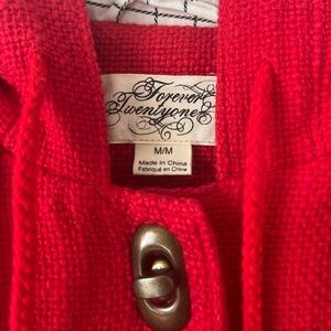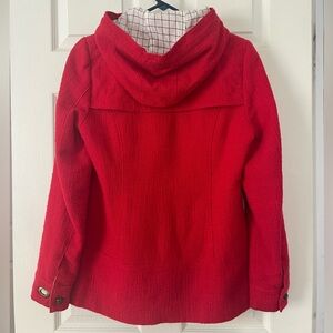 Hooded red cotton jacket with metal toggle closures. By Forever Twenty-one. Fully lined with white checkered cotton. Drawstring in hood. Size: Medium. Good condition. Mid-weight perfect fall jacket!