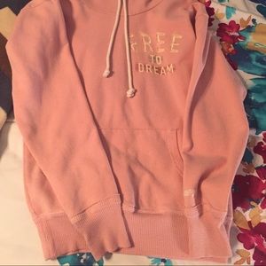 Moderately work hoodie. Fits a little tighter, neckline is a little higher. Light to pastel pink in color.